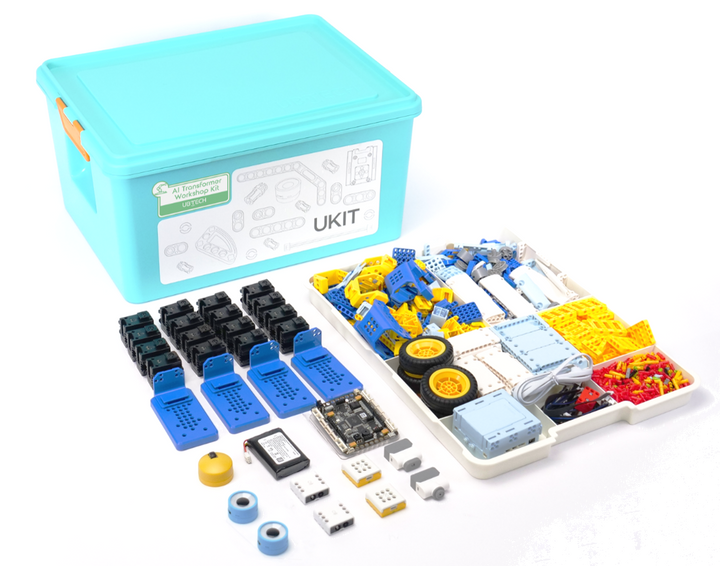 “AI Transformer” in its educational kit lineup indicating this kit is part of their core AI robot modules. Students can do project based learning, building models that physically transform. uses the same uKit AI controller as other kits, so full AI processing capabilities (1 TOPS, sensors, offline AI) apply. Comes with a set of structural parts (plastic building blocks), servo motors, sensors, and possibly a camera to recognize gestures / motion