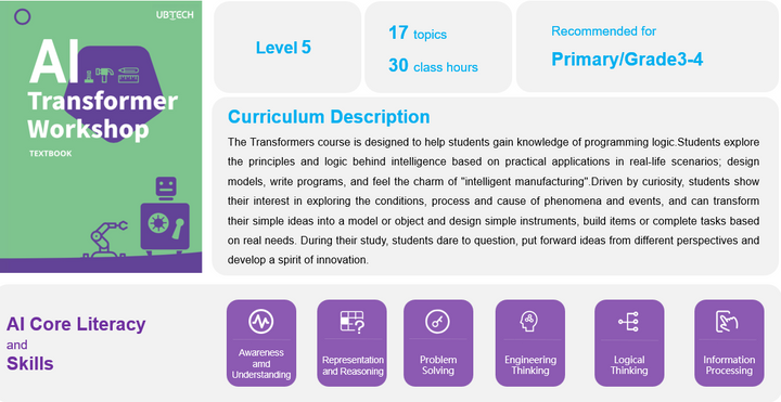 The fifth level is the "Transformer workshop", a training kit that teaches enthusiastic students and interested children about the applications of artificial intelligence and robotics by building 9 pre-designed robot models and 30 hours of teaching material. The Transformer Workshop package is a higher-level product of the intermediate-level tutorial packages in the uKit AI series, so it only repeats the basic concepts and builds on them to cover the knowledge at greater length. New to the package is the uKit Developer module.