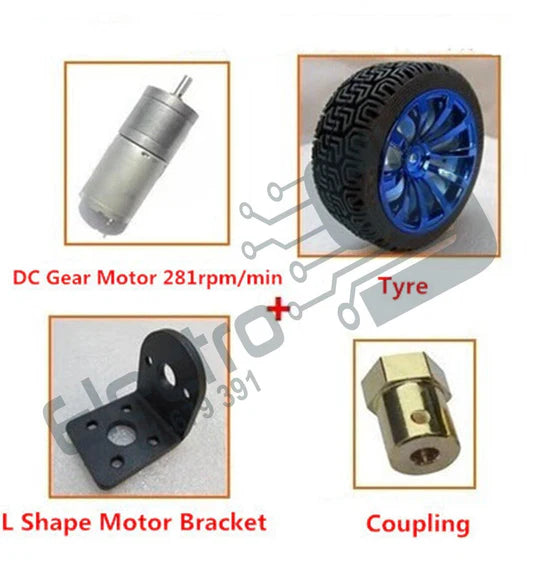 The components shown are a 65mm rubber wheel with a blue plastic rim, a metal gear motor, a black L-shaped mounting bracket, a brass coupling, and assorted screws and nuts. These parts are designed to be assembled into a functional robot or smart car chassis.