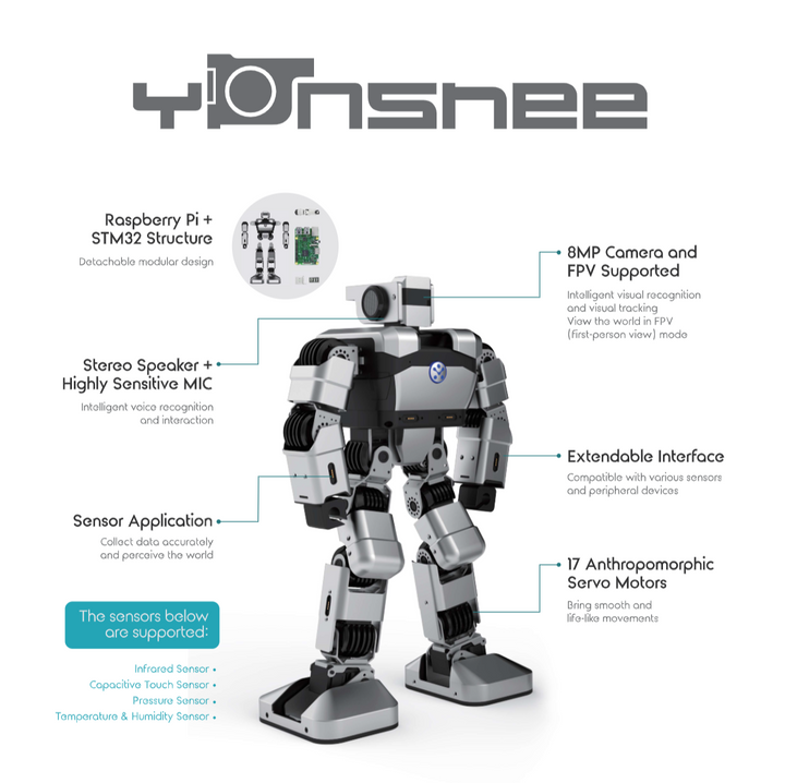 Open robot hardware: Raspberry Pi 3B Master;17 sevo 40Pin interface/6 magnetic suction interface; uKit2.0/Explorer/AIBOX linkage Rich software functions: Strong athletic ability: fast walking , somersaults, push-ups, up and down stairs; Intelligent voice: access to iFlytek AIUI platform, support online/offline voice command; Intelligent vision: more than 10 visual abilities such as face/object/color/gesture; Supporting software: App/batch management tool /VNC Viewer Multi-level secondary development capabilities: Graphic Programming: Built-in PC Blockly, access to uCode YanAPI: Python programming/Jupyterlab programming samples ROS SDK: For robotics professionals Yandev: Developer website Professional courses: K12: AI Behind-the-Scenes Hero, AI Super Designer, AI Application and Exploration(Chinese version) Higher Vocational Education: Artificial Intelligence & Robot Engineering Course Competition scheme: K12: Uchuang future - high school version; Explore new competition schemes Vocational School: Provincial Vocational Skills Competition: Guangdong, Hunan